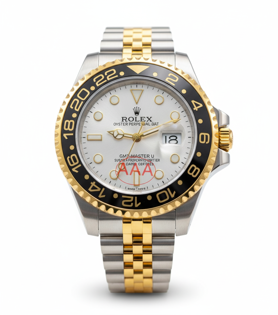 Turn heads with this stylish and premium Rolex-Inspired GMT-Master II Watch for Men, featuring a sleek white dial, elegant black & gold 24-hour bezel, and a standout two-tone jubilee bracelet. Designed in a bold 43mm OG case size, this high-end replica offers both luxury appeal and daily durability at a great price.
